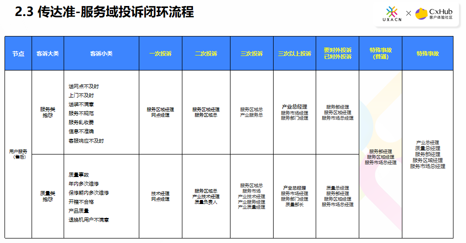 我们以服务的投诉场景举例,客服收到了用户的投诉,每一类投诉问题我们就会给到对应的负责人去处理,比如质量投诉——开箱不合格,这时候就要要求服务商4小时内登门服务。有的问题,给到的责任人,责任人发现可能我自己解决不了,需要其他人员协同处理,就会线上去协同相应的人员一同解决,并且如果解决不及时,系统会自动升级给上级领导。也就是这样一套机制,保证用户投诉问题,快速解决。
