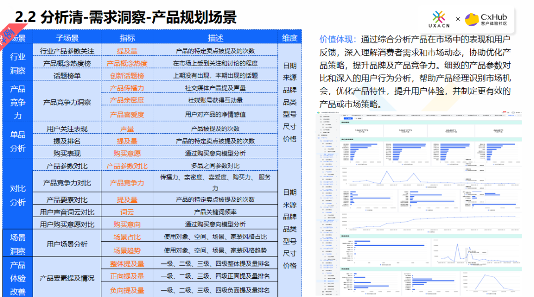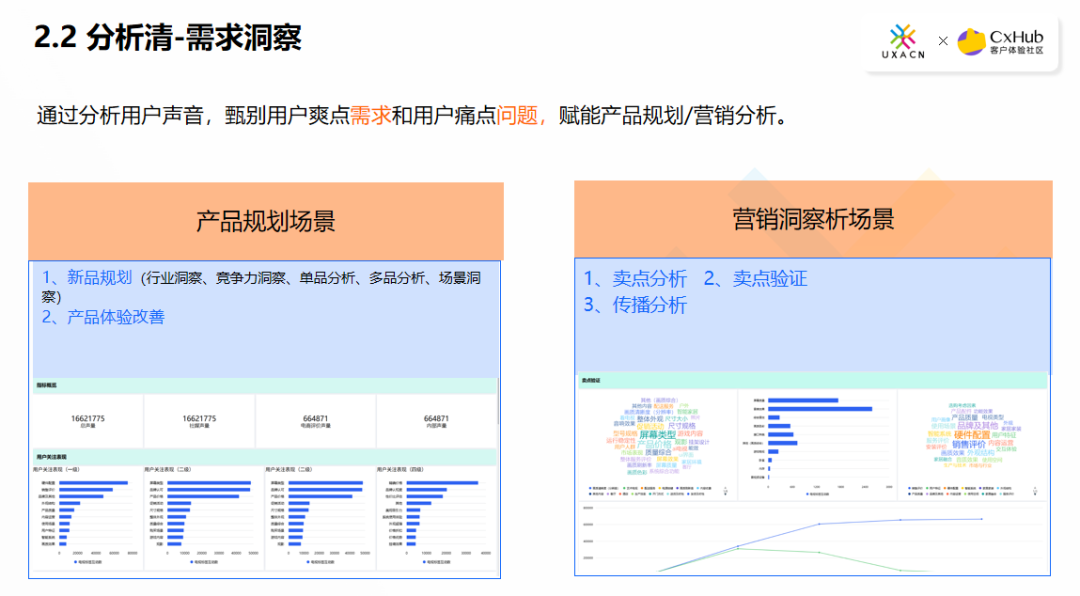 先看左侧产品规划场景,这里解决一个本质问题:如何从海量用户声音中淘金?从行业洞察、竞争力洞察、单品分析和竞品或者我本品不同系列的对比分析、用户使用场景的洞察,来预判我品未来的规划迭代方向。