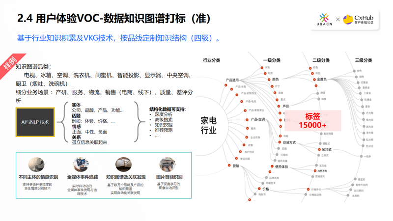 还有情感标签,分为正向的、负向的、中立的情感。我们也是实施家电行业居多,在家电行业沉淀了15000多家电体系,这里有个小技巧,可以结合大模型,针对我们所在的行业进行一个初步分类,在这个基础上去进行逐步的完善。但是大模型给到的还是一些通用性的标签,并且不会给我们很多,如果企业从0-1建设,可以作为一个参考。真正要落地,还是建议找一些有相关经验的企业来实施,少走弯路。