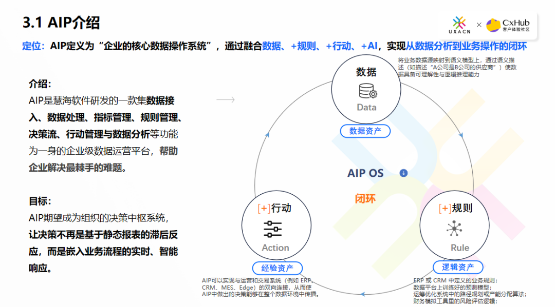 我们落地的时候是基于AIP平台,他是一个企业级的数据操作系统,帮助企业实现数据、规则、行动管理的闭环。