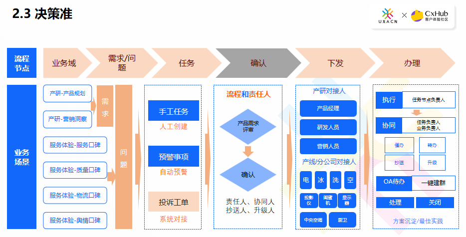 当有了需求和问题后,就要流转到后面的流程去进行解决,比如用户的需求,比如说电视亮度不够,这可能是我们需要改善的地方,但是我们不能用户期望怎么样就去重新设计产品,我们是需要产研部门去验证,要结合市场、产品定位等各方面因素去做判断,这时候,我们就要有确认的过程,确认后会给到产研对应责任人去执行落地改善。
