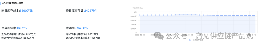 - 近30天库存周转率:近30天净销售出库成本/近30天平均库存成本