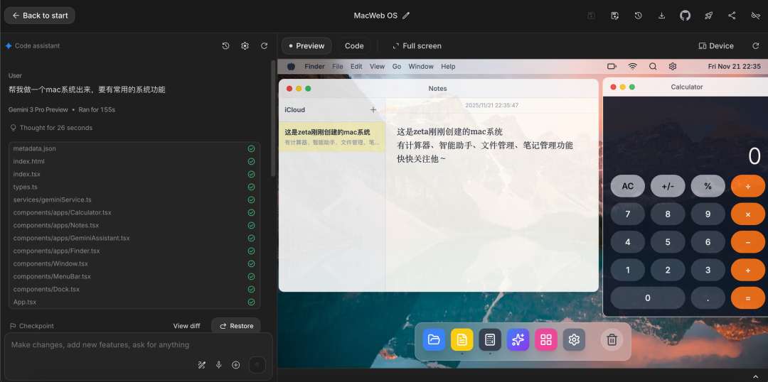 这些的确都是真实的、可复现的案例。相比历代的模型,包括最新的gpt-5.1-codex-max、Claude sonnet 4.5,Gemini 3在前端页面的设计与审美上都完爆了其他选手。以下是我的几个例子,你可以看到的确就是由屏幕左边一句话生成的。