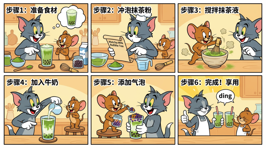 做餐饮 / 新茶饮的:直接让它帮你制作一组六宫格漫画,内容是 Tom 和 Jerry 在教我们如何做抹茶牛奶气泡水,然后配上品牌 LOGO 和配方步骤,发小红书、朋友圈都自带记忆点。