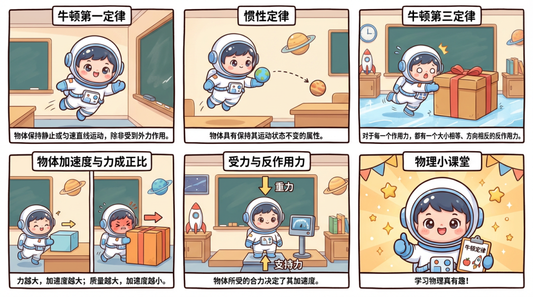 做教育 / 培训的:让它画一组“Q 版物理小课堂”,用小宇航员形象讲牛顿三大定律;或者一套“数学解题流程图漫画”,把抽象步骤变成一格一格的连环画,直接发给学生当课后补充材料。