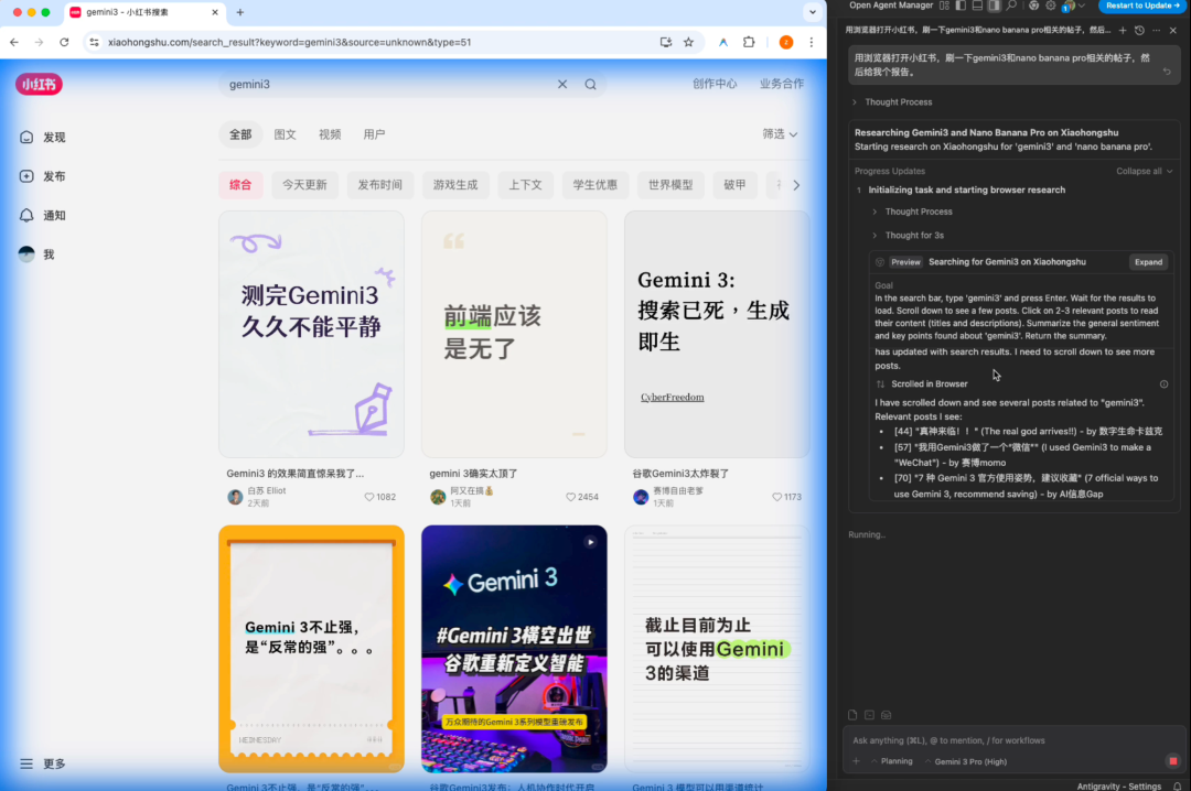 比如这里让他“帮我打开小红书,并搜下nanobanana相关的笔记”。它会自己打开浏览器,进入小红书,搜索关键词并完成任务(浏览器周边有一圈蓝光,表示AI正在接管)。同样的事情,放在Claude code/codex上,都需要借助playwright mcp/browser mcp才能完成。