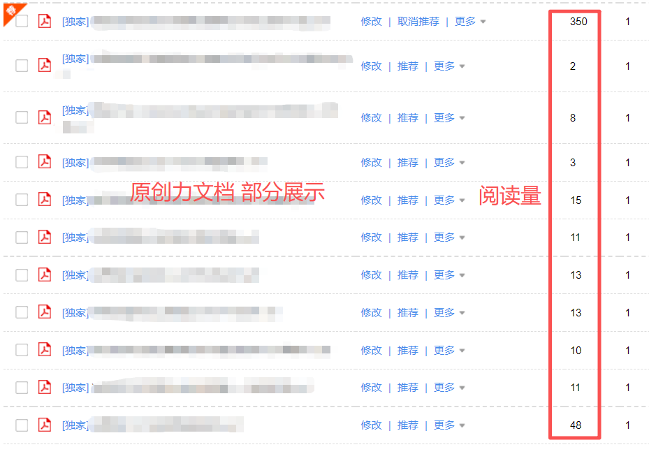 推荐优先百度文库和原创力文档,阅读量高,这两个平台会自动给优质文档设置vip文档或者独家显示。尤其是百度系的百度文库,非常适合做百度seo,下面贴吧、百度问答同理。