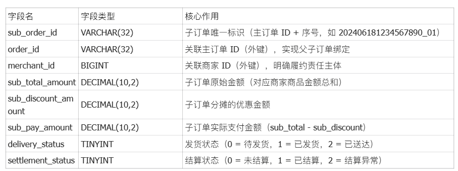 - 履约关联:sub_order_id(子订单 ID)绑定订单商品表、库存锁定表,明确 “商品 – 履约单元” 的对应关系;