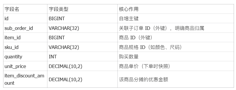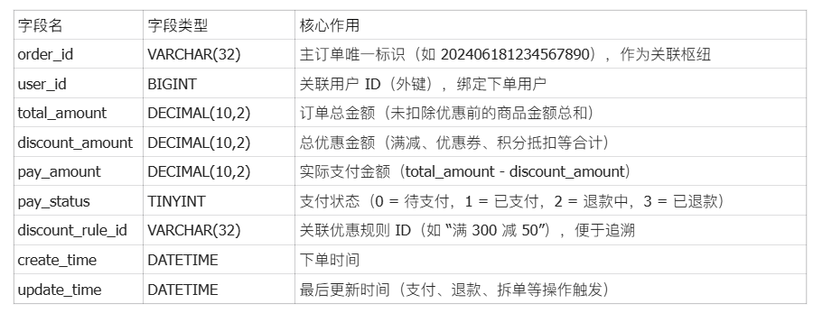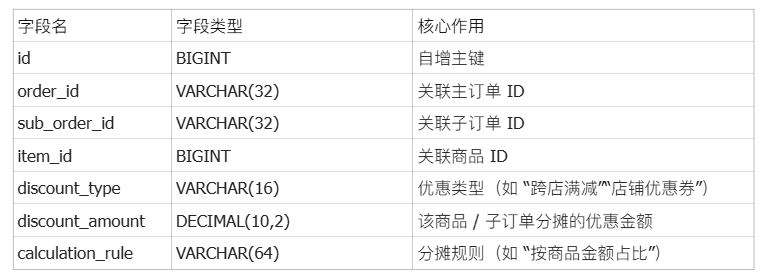 - 关联枢纽:order_id(主订单 ID)串联主订单、子订单、优惠分摊表,实现全局数据追溯;
