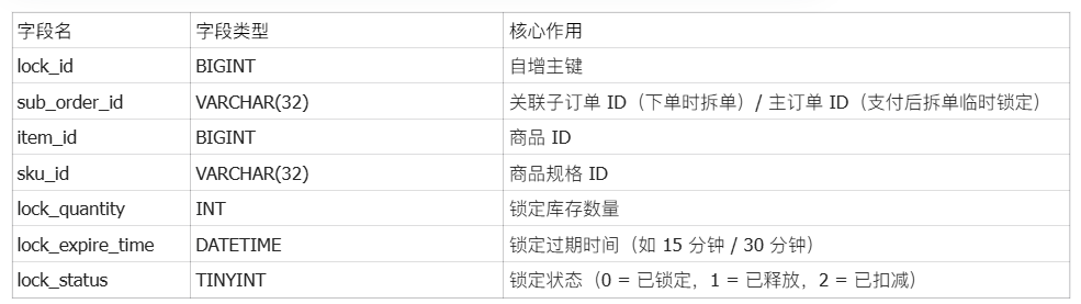 - 临时库存锁定表(inventory_lock_temp):支付前临时锁定库存,避免超卖,拆单后转为正式库存锁定记录。