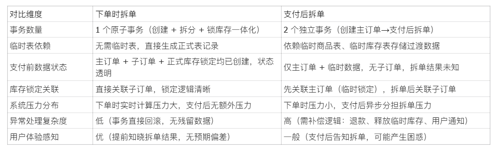 - 核心优势:用户下单时即可知晓拆单结果(如 “共 3 个包裹”);优惠分摊实时计算,支付页金额透明;拆单与主订单创建在同一事务,数据一致性强。
