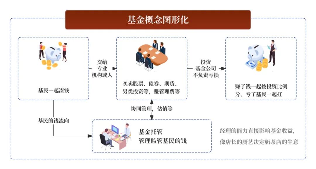 通俗理解:基民(韭菜)把钱凑在一起,交给基金公司去投资(买卖股票、债券、期货等),赚了钱一起按投资比例分,亏了基民一起扛,基金公司不负责亏损,基金公司收益来自申赎费、管理费等费用。