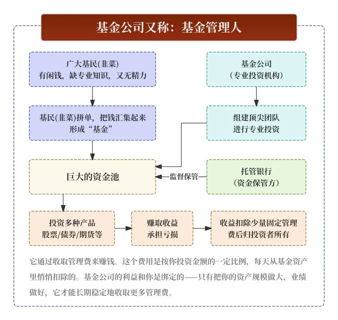 通俗理解:又称基金管理人,必须持牌;基民(韭菜)出钱、它出脑力和体力,帮你专业投资股票、债券、期货等的机构。基民享受投资的收益(同时承担风险),它则收取固定的“辛苦费”(管理费等)。它的本质:“受人之托、代客理财”。