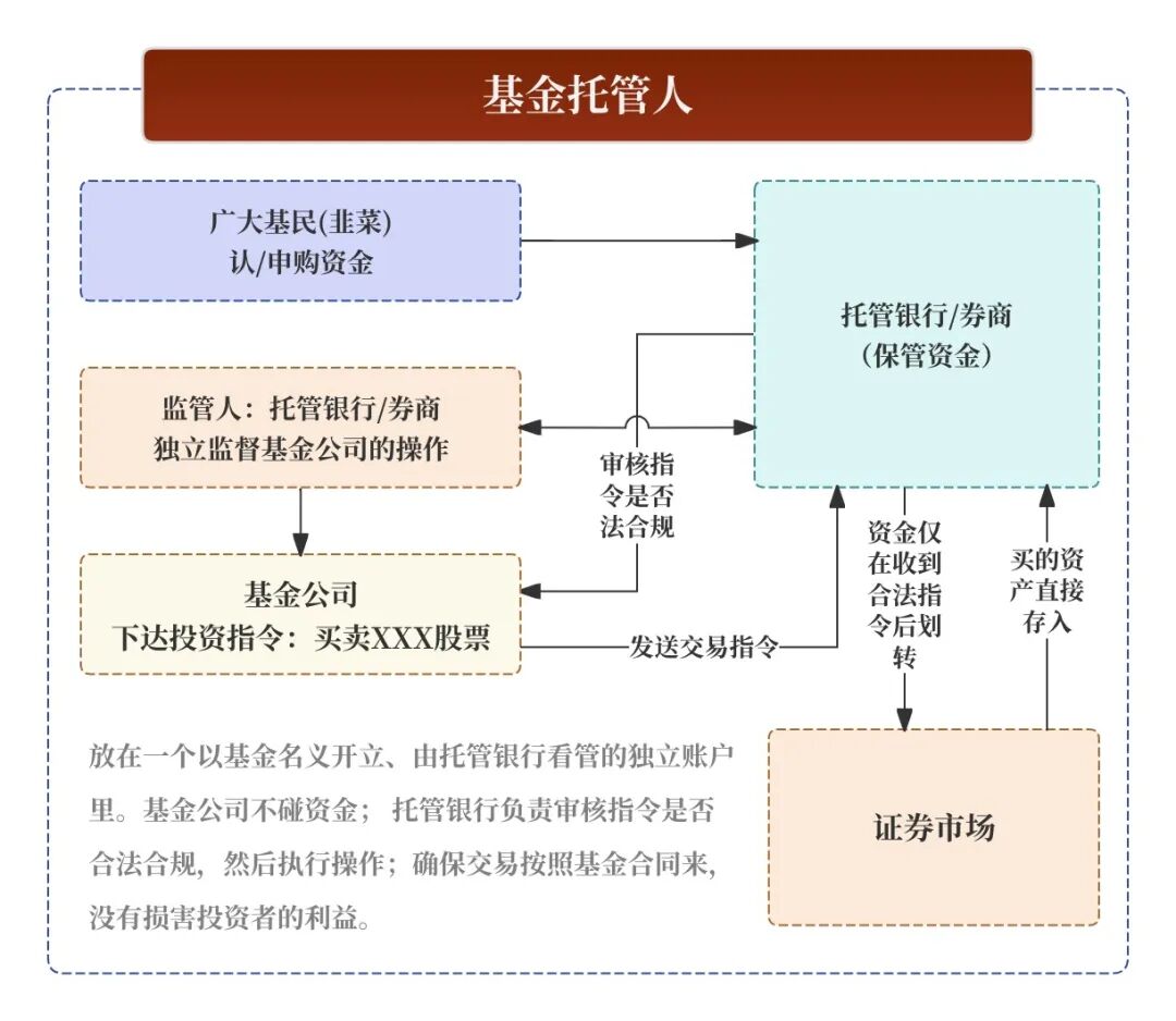 通俗理解:找正规权威的第三方(银行)来替基民(韭菜)管钱和记账。基金公司只有“动脑”的投资权,没有“动手”的拿钱权。目的彻底杜绝基金公司卷款跑路或挪用资金的风险,确保基民(韭菜)的钱绝对安全,不被挪用。
