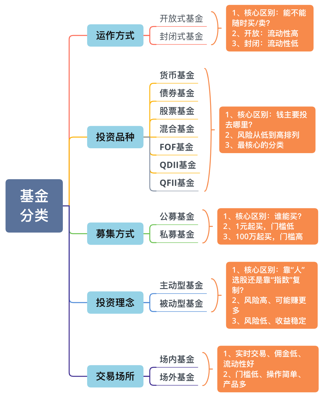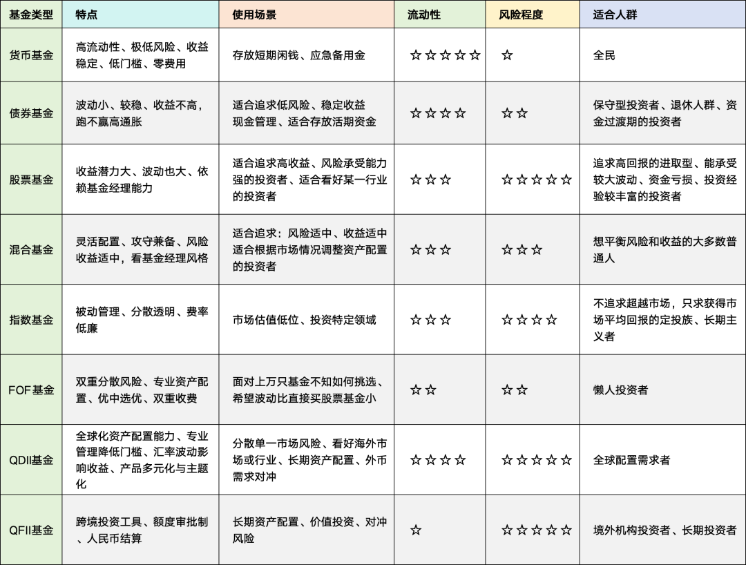 每种基金分类都有自己的特点和使用场景,在投资时要结合自身的风格、投资目的、财务状况、风险承受能力等去挑选。重点介绍下最核心的分类:投资品种,如下图所示。