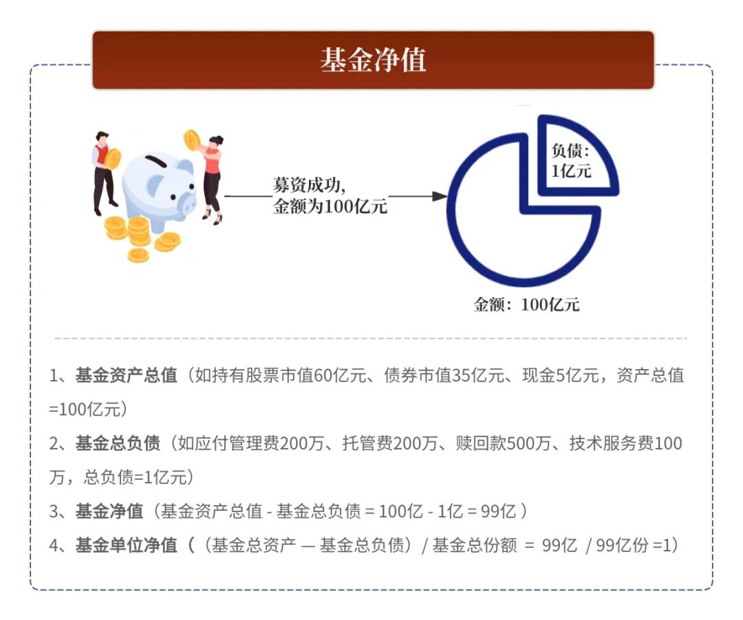 举栗子:隔壁大王成立了“牛掰芯片基金”,好不容易募资到100亿元,其中总负债(手续费、借款、运营费等)合计10亿元,基金净值=100-10 = 90亿元,基金总份额90亿份。
