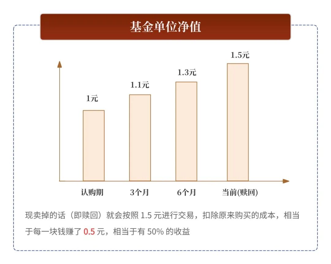 举栗子:净值是1.5元,相当于每一份基金目前的价值是1.5元,在认购期买的话,那当初买的时候的净值就是1元,卖掉的话(即赎回)就会按照1.5元进行交易,扣除原来购买的成本,相当于每一块钱赚了0.5元,相当于有50%的收益。