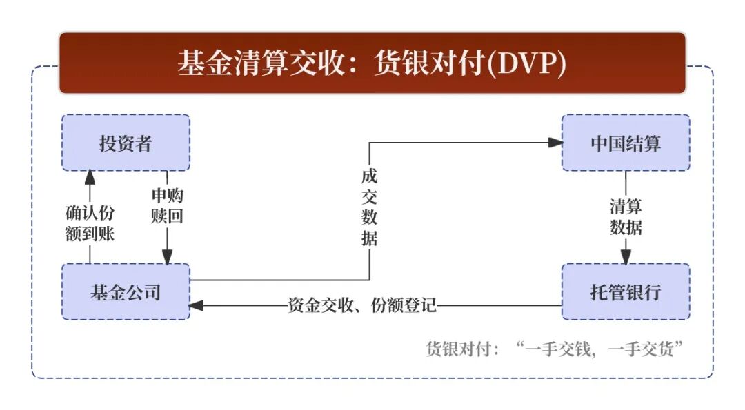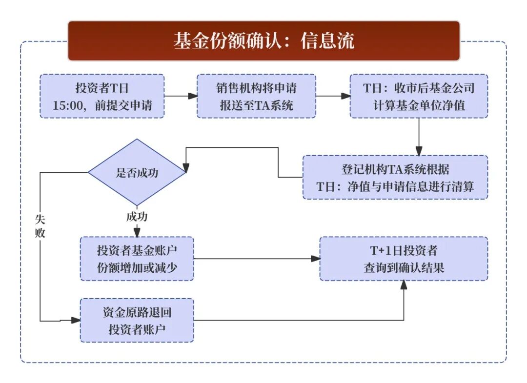 - T+1日:交收发生。投资者的银行账户完成扣款(资金交收),基金公司确认份额并登记到投资者的TA账户(基金账户)中。投资者收到份额确认通知。