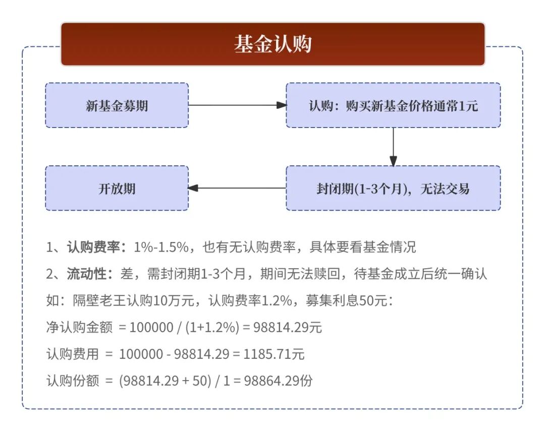 - 认购份额 = (净认购金额 + 募集利息) / 基金面值(1元/份)。
