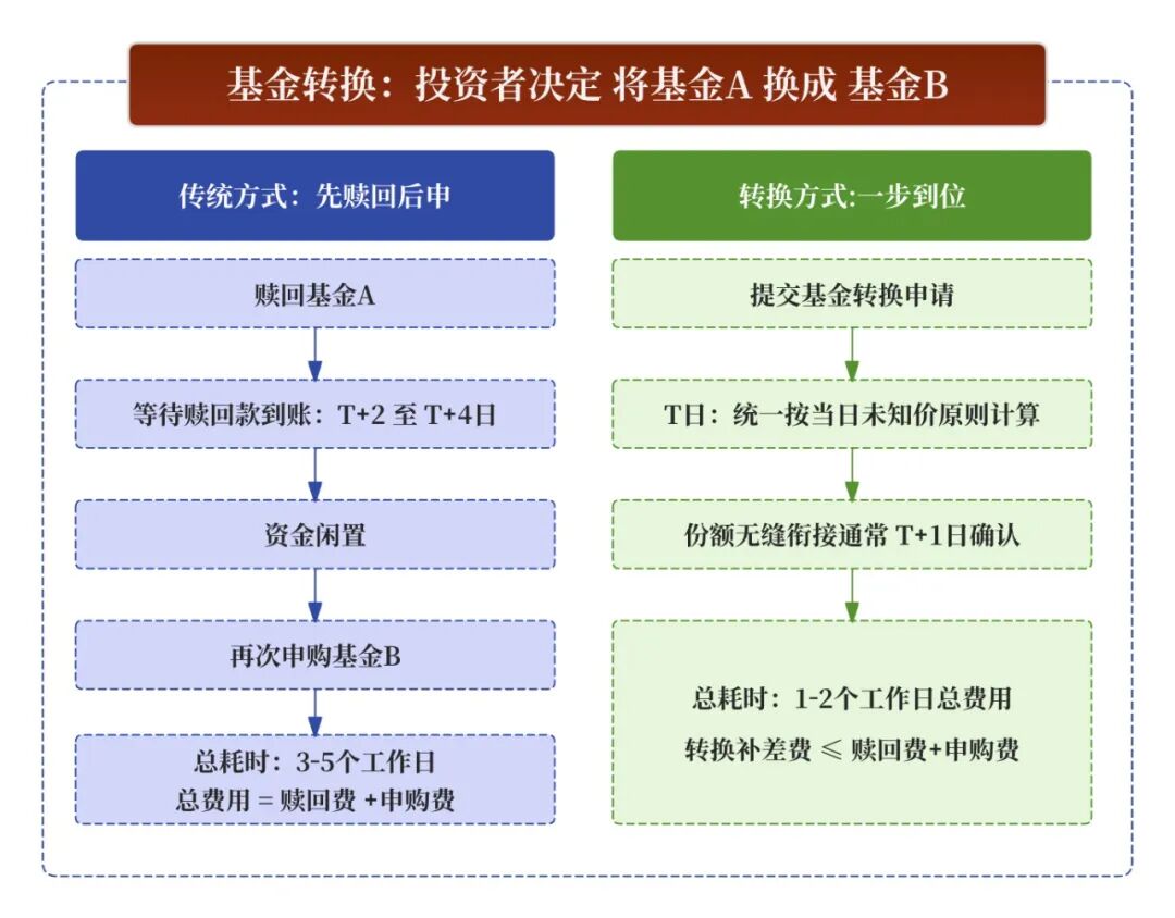 转换本质:在同一家基金公司内,把A基金”直接搬家”到B基金,省时省钱不踏空。