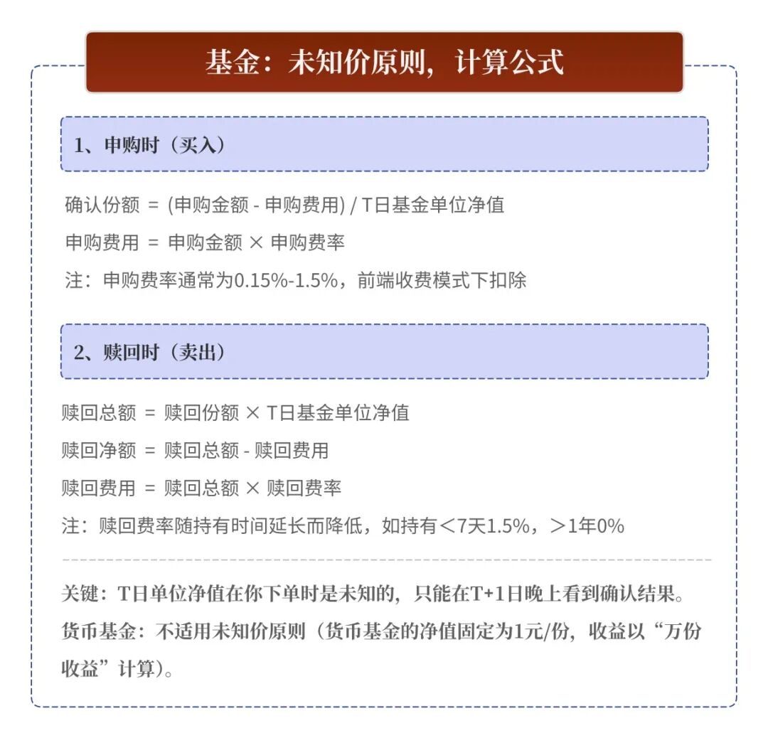 - 赎回确认金额公式:赎回总额 = 赎回份额 × T日基金单位净值;赎回费用 = 赎回总额 × 赎回费率;确认到手金额 = 赎回总额 – 赎回费用。