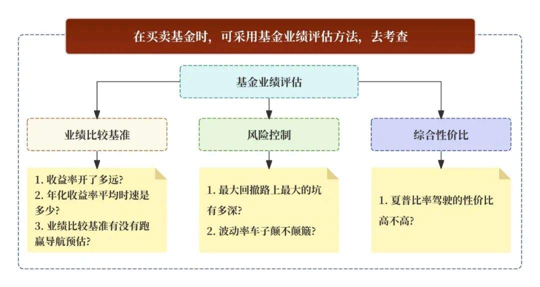 敲黑板画重点:梳理下可采用收益率、年化收益率、业绩比较基准、夏普比率、最大回撤、波动率等去评估基金业绩,避免入坑。如下图所示。