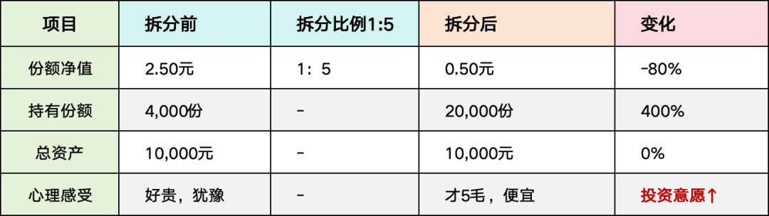 通俗理解:大额钞票换零钱,通过增加份额数量、降低单位净值的方式,使基金净值“变得便宜”。