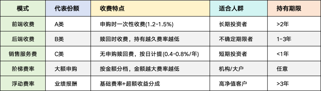 通俗理解:买基金时要付的“手续费”怎么算。主要有三种:前端收费、后端收费、C类收费。