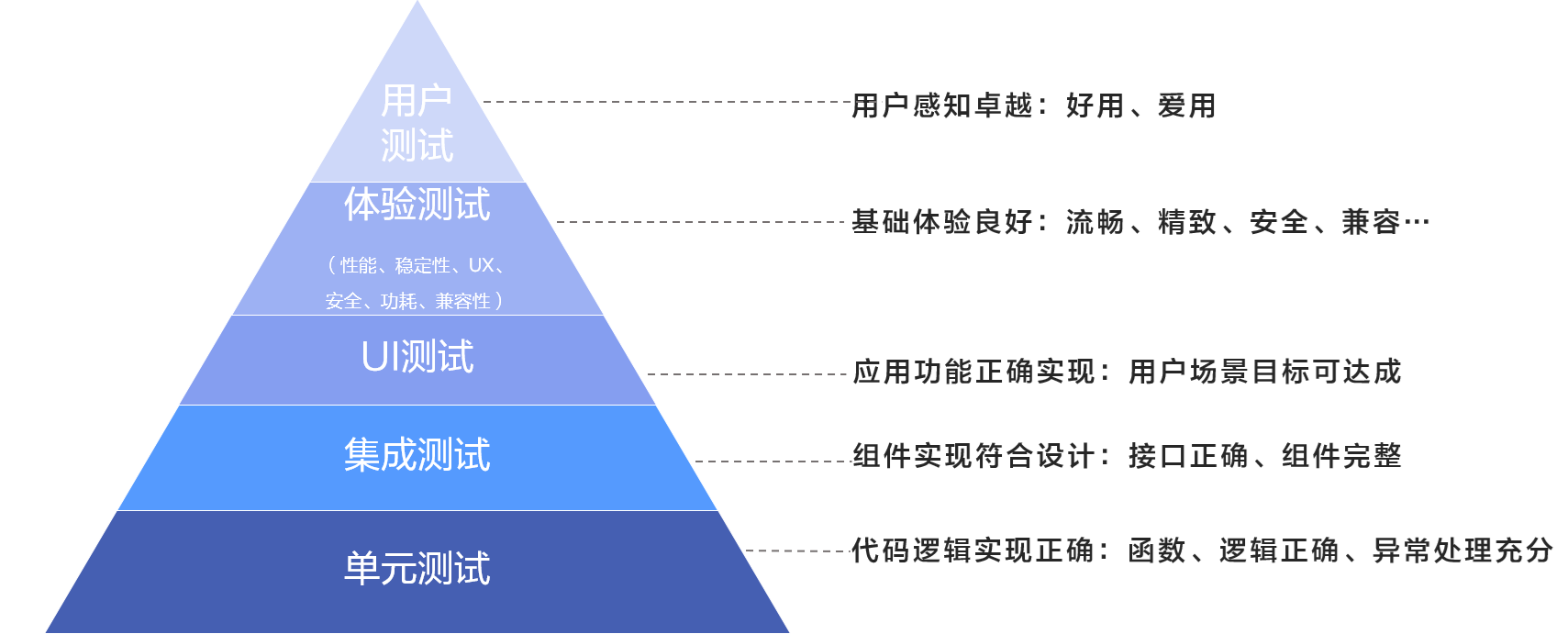 如下图所示,这是应用在开发过程中典型的测试活动模型和测试活动质量目标,一般分为单元测试,集成测试、UI测试、体验测试和用户测试。