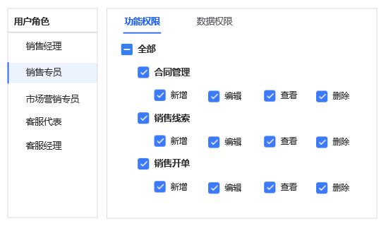 另外,例如像“销售专员”、“客服代表”如果权限完全一致,那可以都授权“客户管理人员”这个角色就行,就不需要每个岗位都一一去配置权限了。