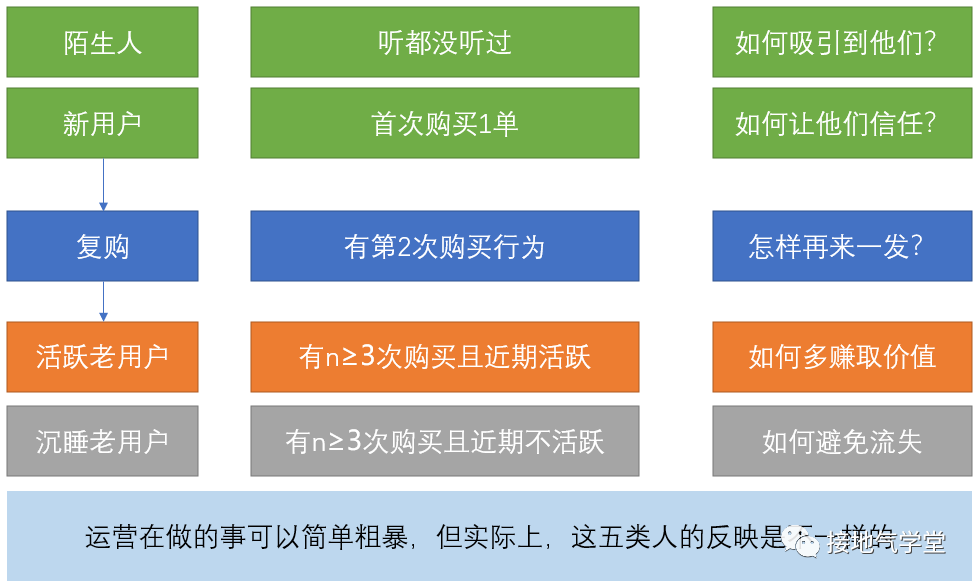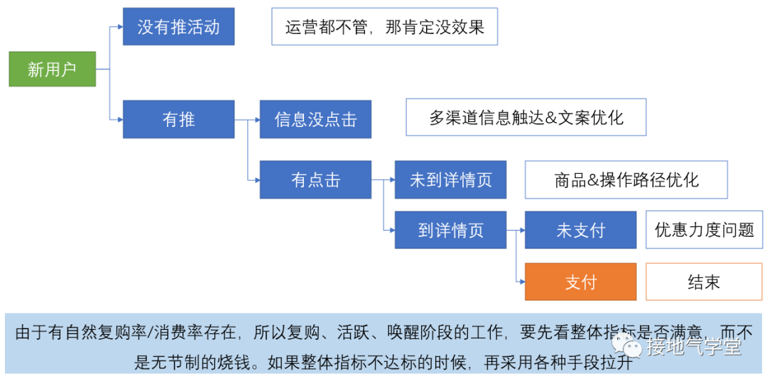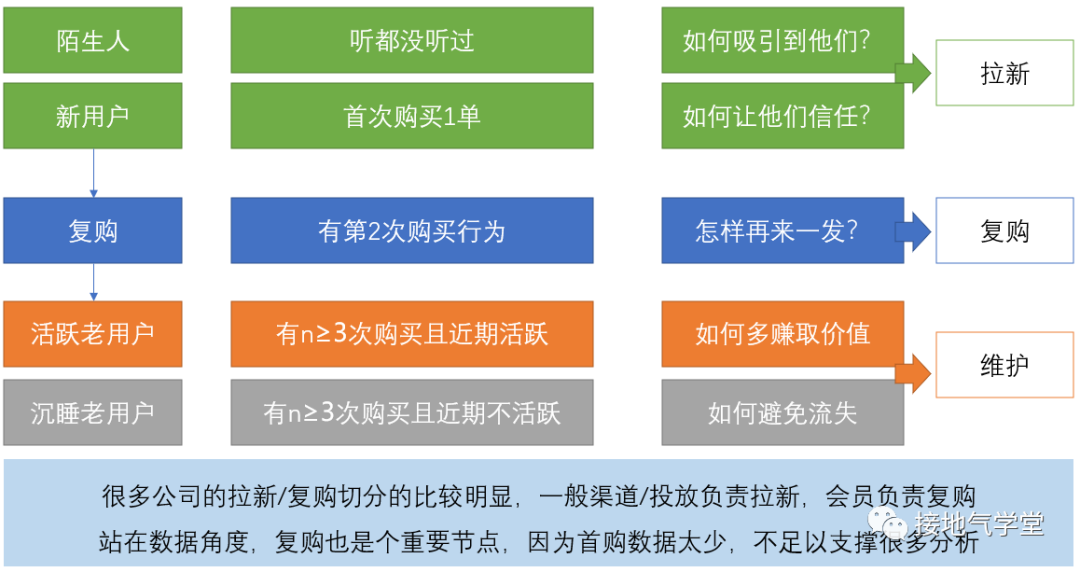 为什么用户不复购?如果直接问数据分析师,估计能把人问傻,但结合之前新人阶段策略以后,就能得出更深层分析结论: