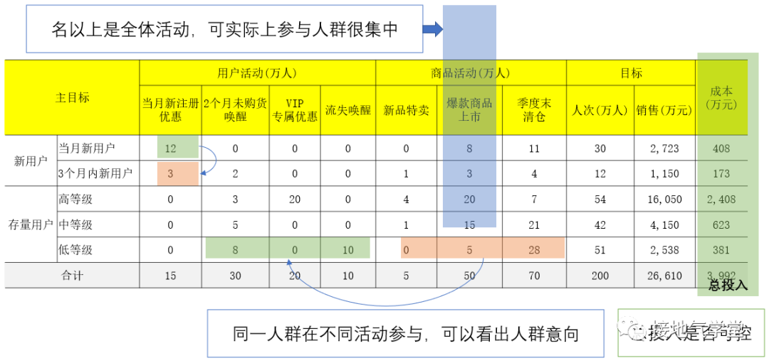 这些问题,在单一的活动复盘里很难讲清楚,但把所有活动围绕活动编织成策略组,就看得很清楚。能及时发现活动间堆叠,能基于每个用户计算清楚到底投放成本去到多少(如下图)。