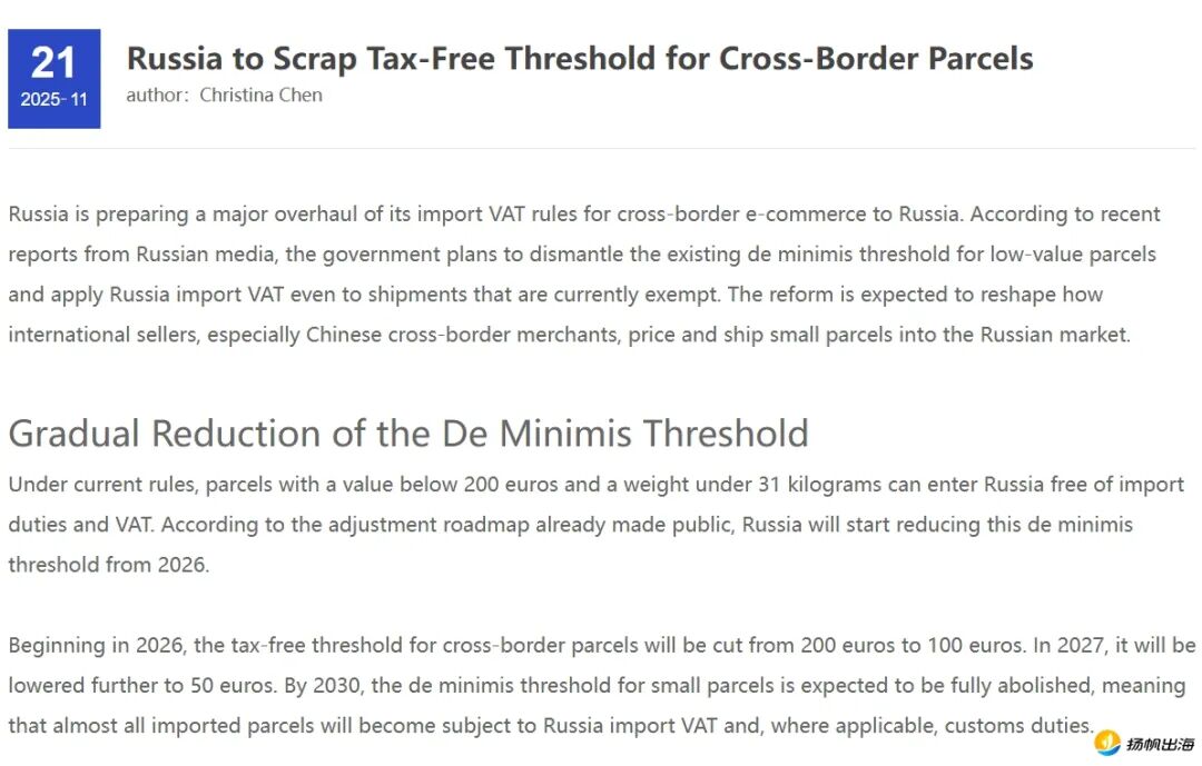对于中国卖家而言,俄罗斯市场的不确定性还来自政策的变动。近期,有消息称俄罗斯政府宣布计划自2027年起逐步取消跨境小包免税政策,逐步取消当前对价值低于200欧元和重量低于31公斤的小包裹的免税政策;并计划在2030年全面取消;同时,增值税率也将渐进征收。