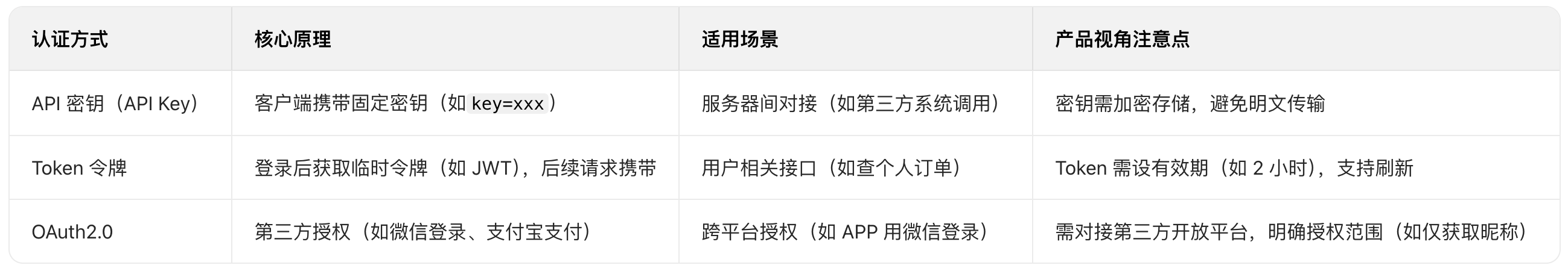 下面表格中是几种常见的认证方式,可以根据不同的场景来使用,产品经理了解即可: