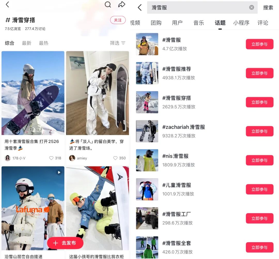 同时,社交平台也开启助力。小红书联合品牌推出“时髦运动提案”活动,抖音发起#用滑雪的姿势进入冬天 活动,都是在推广滑雪运动,实际上为滑雪装备的日常化使用提供了内容广场,也吸引了更多用户参与。