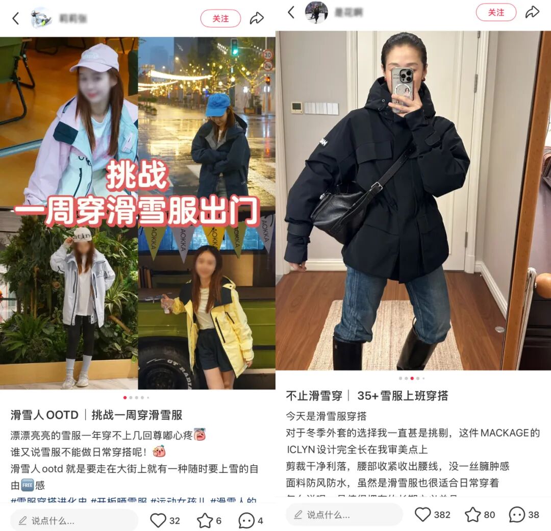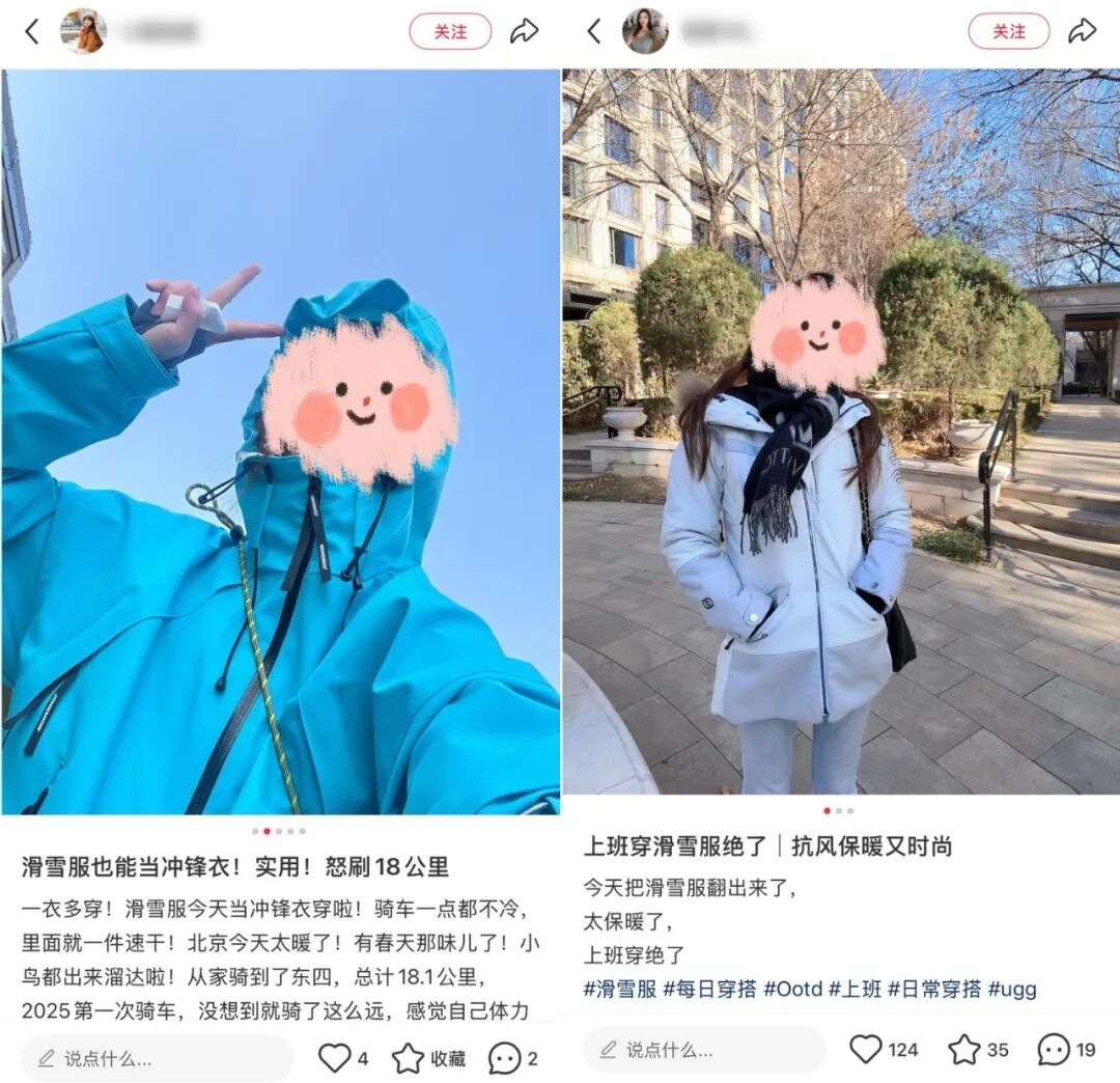 用户在平台上分享通勤穿搭、省钱攻略,这些内容进一步降低了消费决策门槛,让更多人愿意尝试滑雪服通勤。