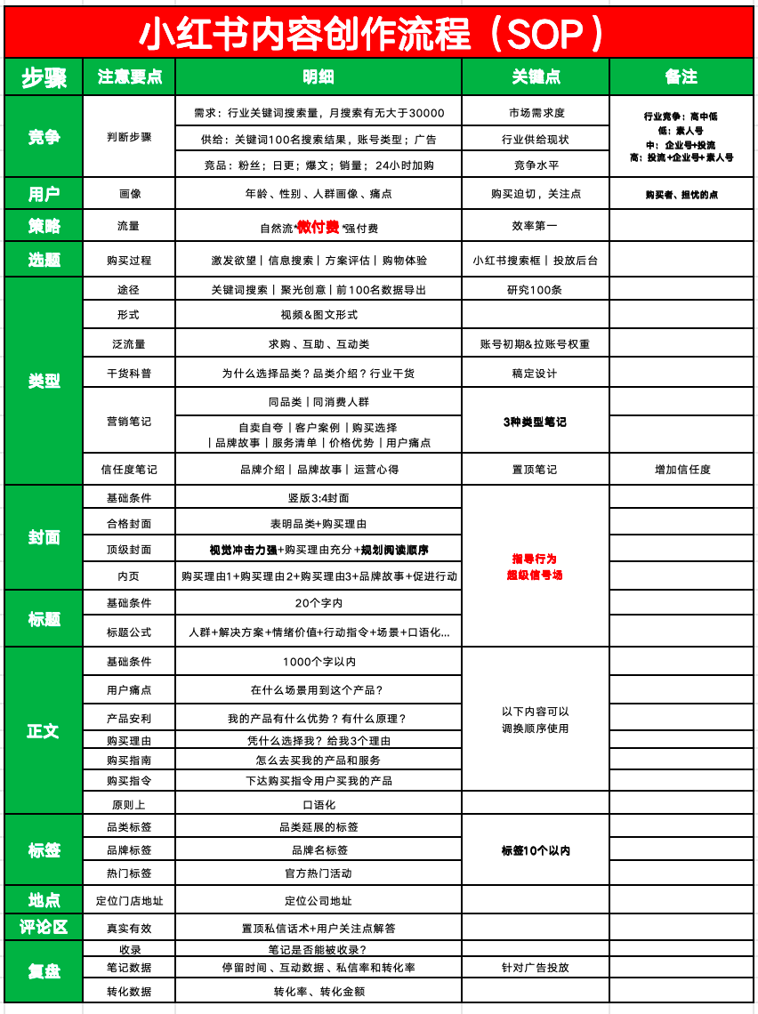 好的投放素材,首先得是一篇合格的小红书笔记。它需要满足以下信息;小红书内容创作可按照以下SOP;