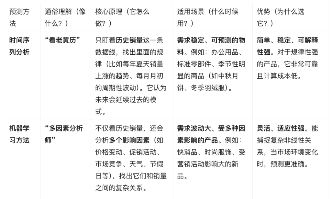 在实际应用中,产品经理会根据不同物料的特点选择合适的预测方法,甚至采用混合策略。例如,对于需求稳定的常规物料,可采用时间序列分析;对于季节性商品通过集成模型进行预测。