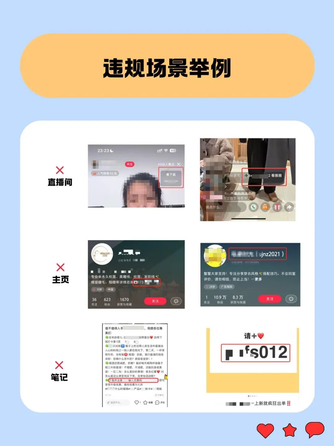 为了让大家更加直观感受到违规场景,小红书官方还截了几个典型的违规场景图片,包括直播间、主页、笔记等等,这意味着这些小动作引流的方法被小红书发现了,现在给你封住。