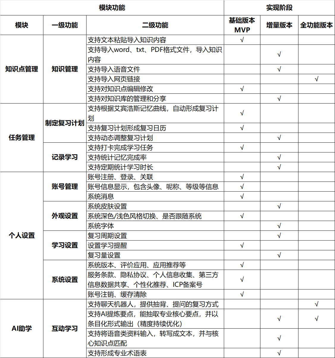 设计一个可提供周期性记忆提醒(如:符合艾宾浩斯遗忘曲线规律)的学习辅助工具,此产品流程也能复用到具有周期性要求的事件上(如:制定每月、每周的大扫除任务)。产品初期先圈定MVP功能,后期迭代版本新增AI技术,能为用户带来更多个性功能。