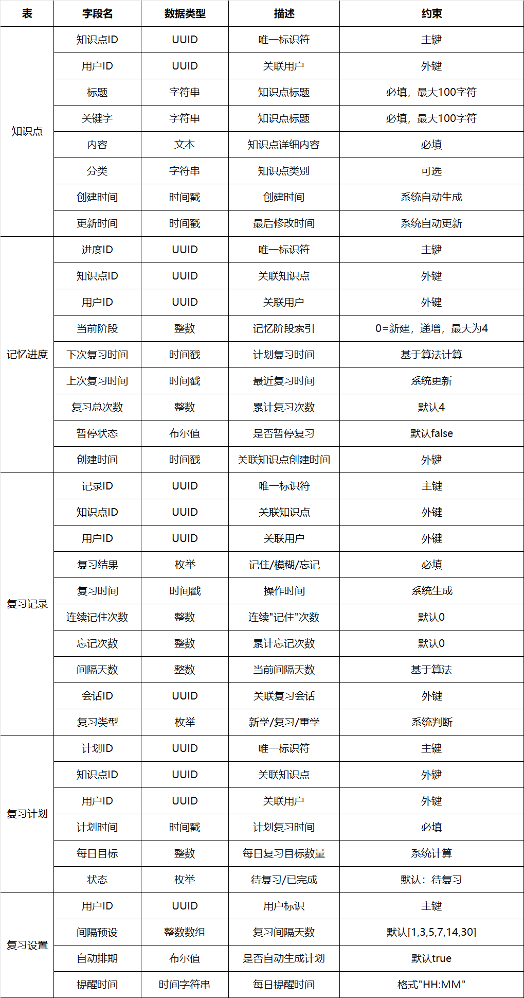 - 复习计划表:用于记录用户每天的复习计划