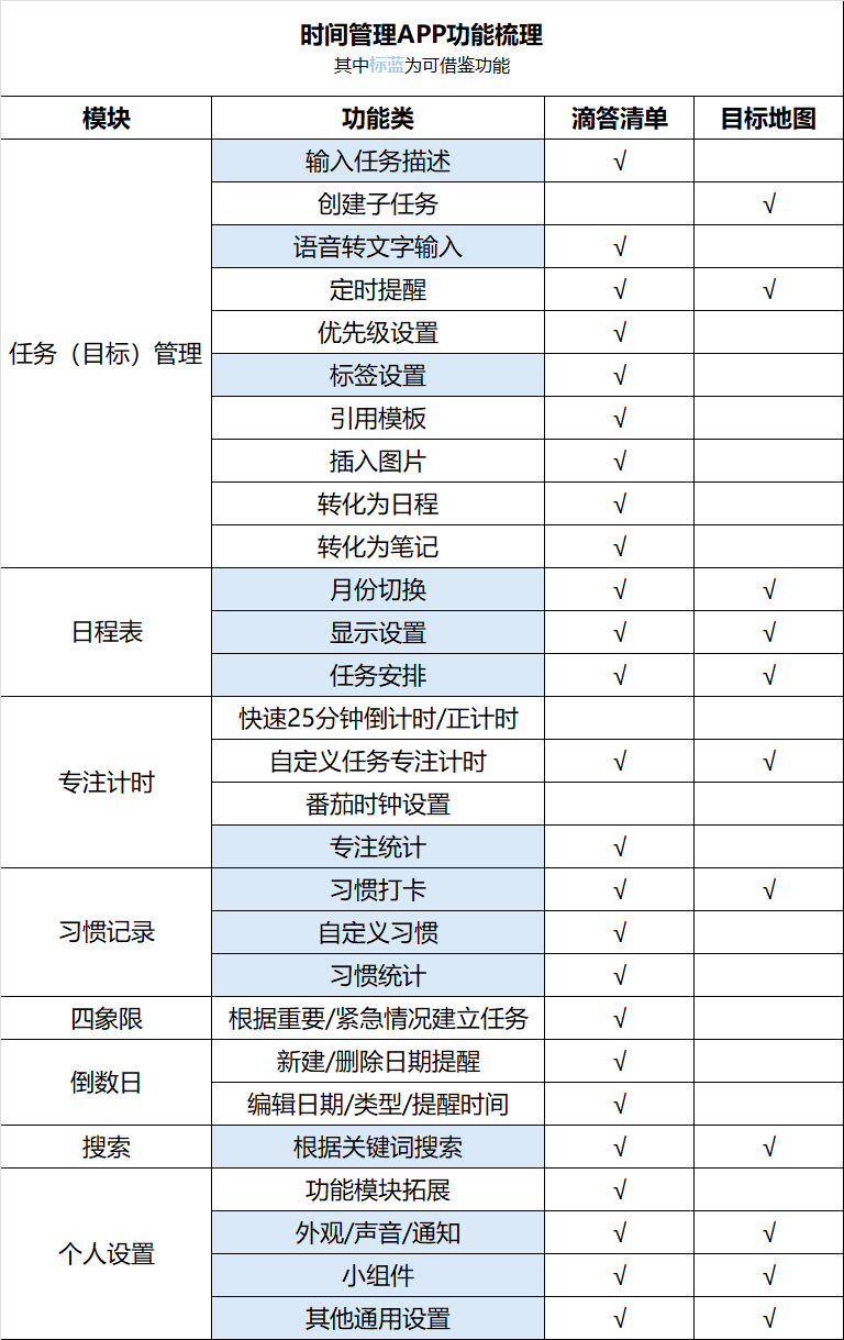 (2)时间管理类产品核心功能梳理: