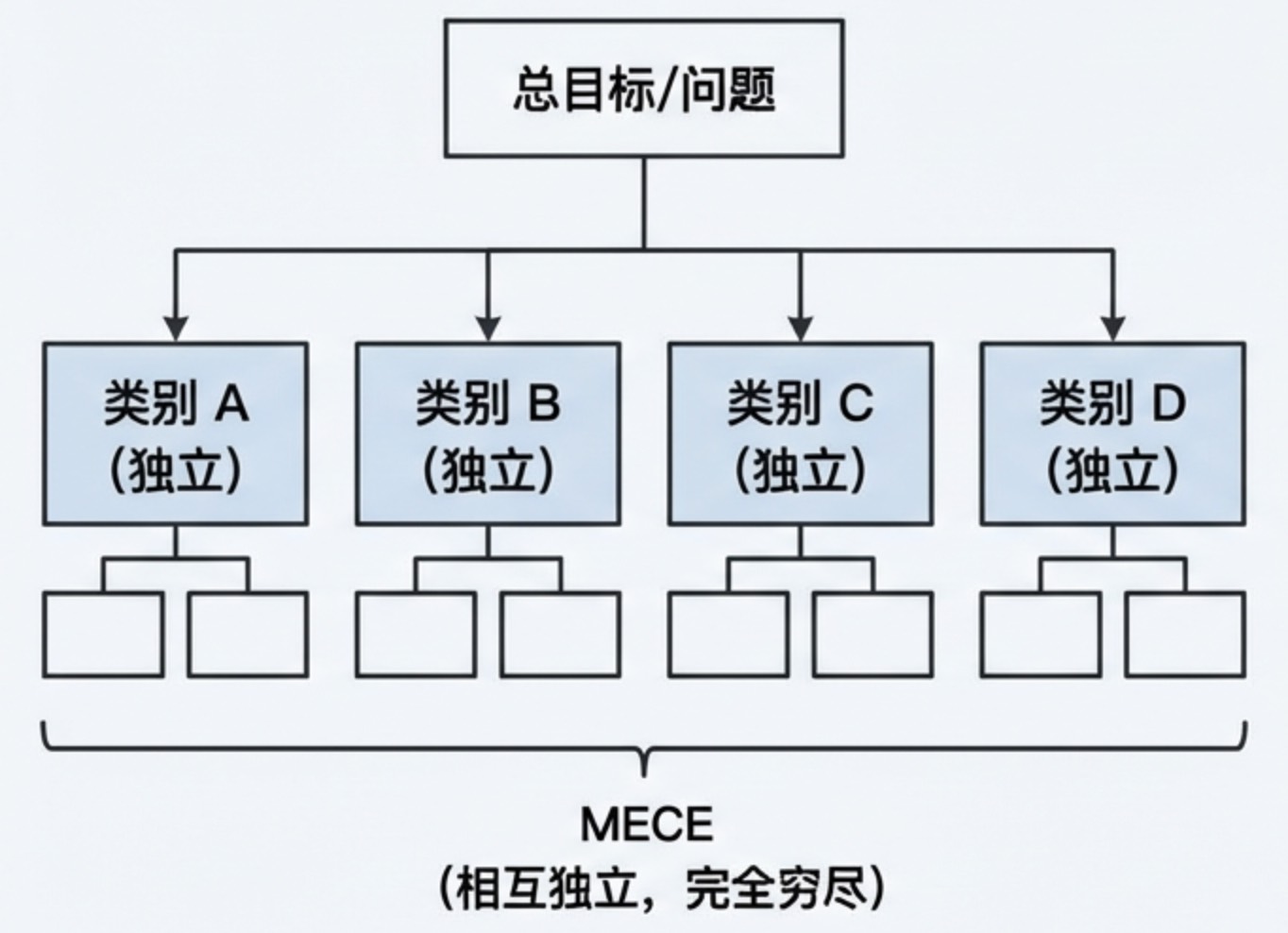 –闭合性的情况下,主要通过归类分组+MECE原则(相互独立,完全穷尽),在确保内容的归类具备自主独立性同时,也要保证内容的全集是完整的。