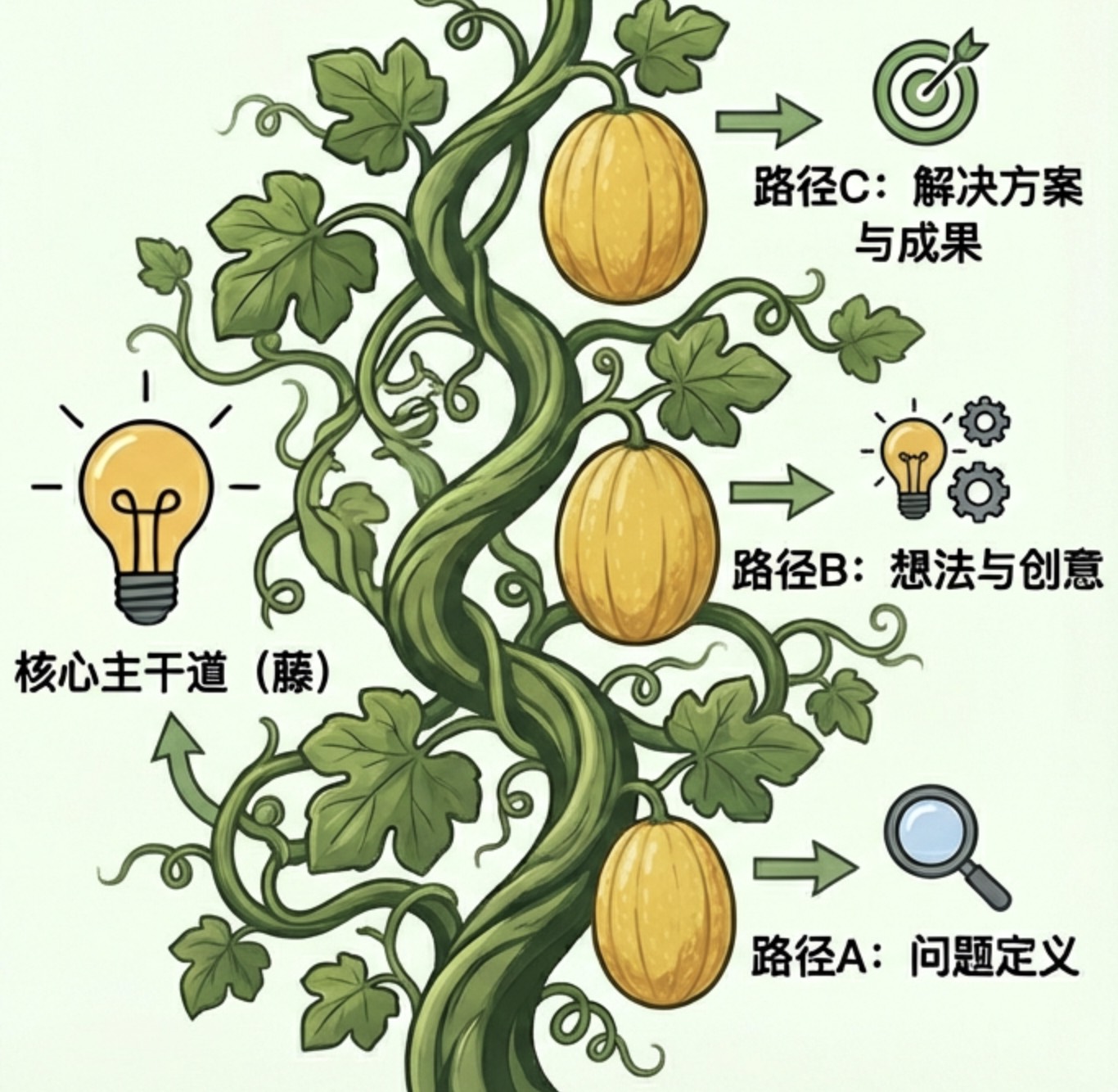 –发散性的情况下,主要通过“顺藤摸瓜”的主干道思维去思考。即我们需要去梳理问题的核心脉络,再在主路径上去进行各个分支节点的思路拓展,只要抓住了核心脉络,就能顺利形成结构化的思考。就像顺藤摸瓜一样,主要你摸对了藤干,顺着这个思路下去就能摸到瓜。