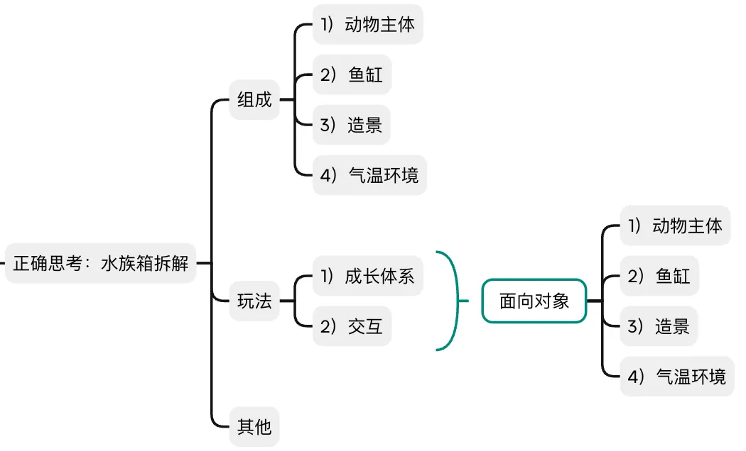 而正确的思考拆解应该是:水族箱:分为组成、玩法、其他。组成元素又可以分为①动物主体、②鱼缸、③造景、④气温环境;玩法又可分为①成长体系、②交互。而玩法所面向的对象又是组成元素部分,相互独立又产生交叉。