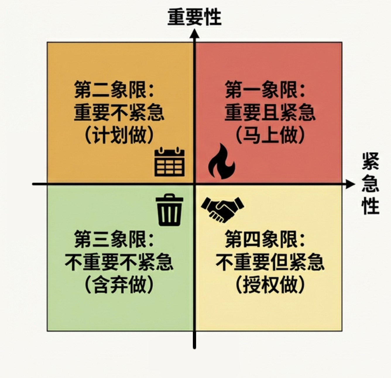 一般我们需要通过「重要-紧急四象限」、「价值成本-ROI」标准去衡量各个事项的优先级,评估哪些事先做,哪些事后做或不做。