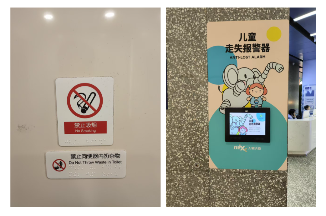 虽然我们生活中的很多大众设计尚且不够好,但能看到一些具备人文关怀的小众设计依然很开心。这样的设计越多,代表的社会越文明、越进步。那些糟糕大众设计被改善的可能就越大。左图高铁卫生间的指示牌逐渐增加了盲文。右图商场里的儿童走失报警器,设计很鲜明、位置醒目。