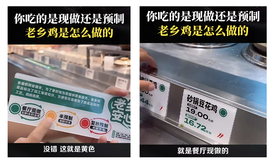 前段时间西贝因为预制菜处于风口浪尖(也不算前段时间了,我完美错过了热点)。西贝苦菜菜,老乡鸡却笑哈哈。因为人们不一定是讨厌预制菜,而是讨厌没有提前告知。老乡鸡的设计就很精妙。每道菜前都有牌子标注,告知消费者哪些是现做,哪些是半预制,哪些是预制复热,颜色清晰易懂。切记任何设计都需要考虑敏感场景,优先保障用户的知情权、隐私权、财产权和生命安全。