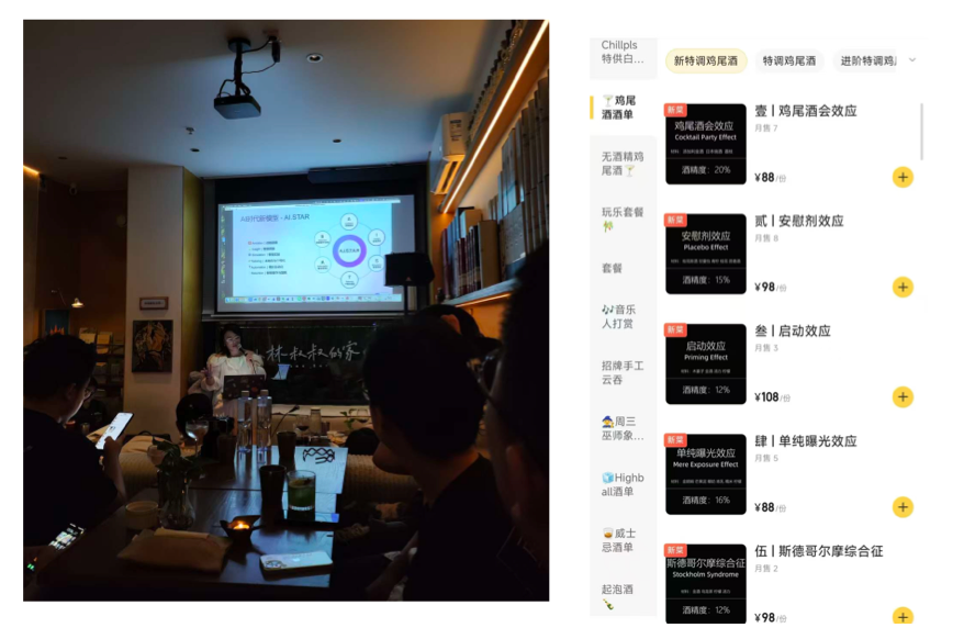 老早就听说有学术酒吧的存在,上次听一个AI分享,顺便体验了一下。这家酒吧就很擅长把握场景、角色、氛围三者关系。首先进门主理人会先让你脱鞋,换上一次性拖鞋,事先营造松弛感。分享开始会熄灭灯光,点上蜡烛,附赠花生米。酒单也很有趣,没有图片预览,名字让人好奇,产生联想,营造不确定性与未知。学术和酒吧两个看似不相干的东西撞到一起,其实就是一种未知,酒单可以看做是一种预期管理。当然还有进步的空间,现场的长条桌还是太规矩了,这种氛围更适合懒人沙发,大家最好东躺西歪。不然拘束的氛围很容易冷场。