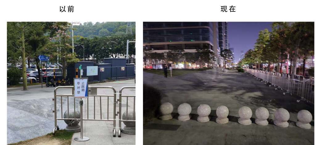 直到有一天发现栅栏不见了,取而代之的是外侧多了一排石墩子,如右图。我才恍然大悟之前的栅栏是为了阻挡电动车进入园区。这就很有意思了,你看,想要设置一个成功的障碍需要考虑障碍的类型、位置。一旦选错,不仅会引发新的问题,甚至会引起利益相关者的反感(本来是阻挡电动车,结果步行的人天天吐槽)。这就像是做设计,要从问题的根源出发,针对目标人群提出针对性的方案,同时考虑边界影响。